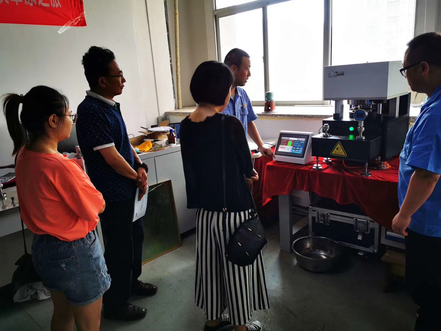 7月8日,某質檢所一行三人蒞臨創威指導,半年為界,吳總經理和郝副總對于創威公司上半年的發展和取得一些相關成績做了簡單的介紹,同時,技術人員在設備展區講解了全自動活塞式壓力計的工作原理,也做了實際的操作演示。