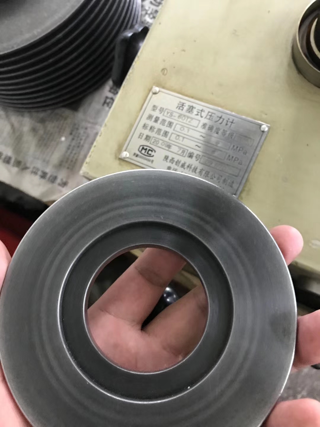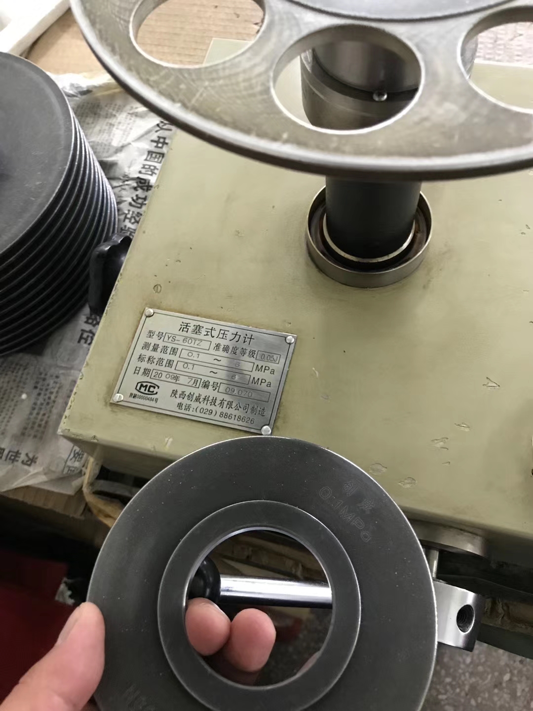 銷售人員走訪客戶,維護創威第一代活塞式壓力計,2009年的設備目前還能正常使用。