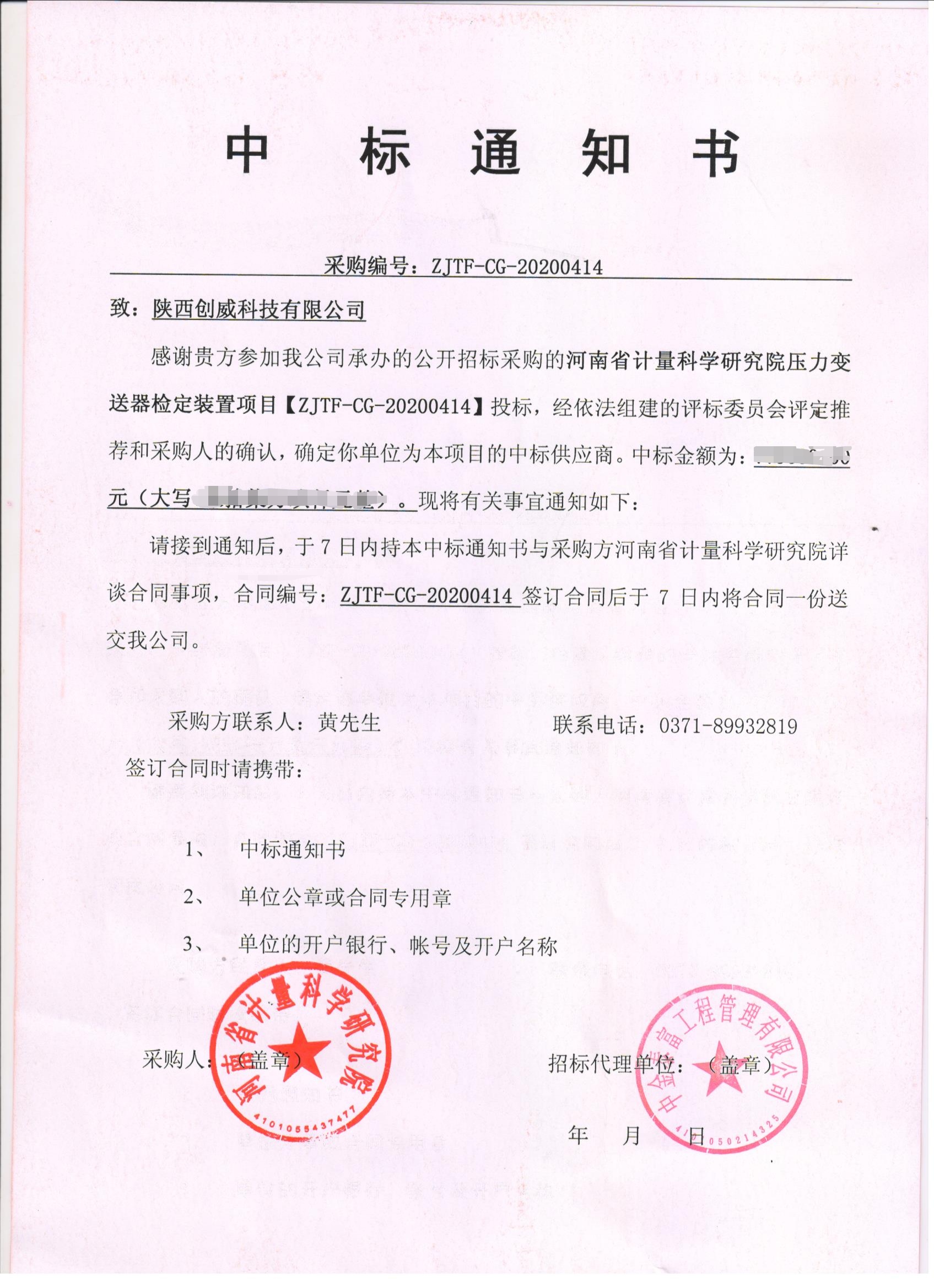 近日,從政府招標(biāo)網(wǎng)獲悉,陜西創(chuàng)威科技有限公司一套全自動(dòng)活塞式壓力計(jì),中標(biāo)河南省計(jì)量科學(xué)研究院。